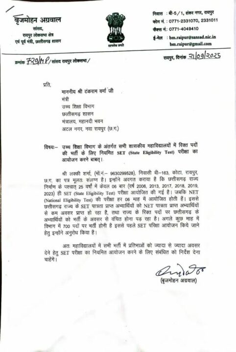 रायपुर सांसद बृजमोहन अग्रवाल ने उच्च शिक्षा मंत्री टंक राम वर्मा को पत्र लिखकर प्रदेश में SET (State Eligibility Test) परीक्षा को नियमित कराने की मांग की है। उनका कहना है कि इस परीक्षा के नियमित न होने से प्रदेश के युवाओं को नुकसान हो रहा है और उन्हें उच्च शिक्षा संस्थानों में रिक्त पदों पर भर्ती के अवसर कम मिल रहे हैं।