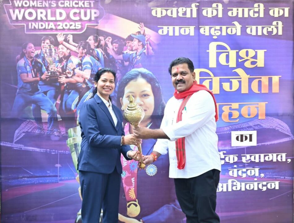 उपमुख्यमंत्री श्री शर्मा ने आकांक्षा को वर्ल्ड कप विजय की बधाई और शुभकामनाएं देते हुए कहा की आपकी सफलता पूरे छत्तीसगढ़ की महिलाओं के लिए प्रेरणादायी है। कवर्धा की बेटी का विश्व विजेता बनने में अमूल्य योगदान हम सभी के लिए गर्व की बात है। इससे हमारे प्रदेश की बालिकाएं भी खेल के क्षेत्र में आगे आने के लिए प्रेरित होंगी। भारतीय महिला क्रिकेट टीम की ऐतिहासिक जीत में आपकी भूमिका ने हम सभी को गौरव दिलाया है। इस अवसर पर उपमुख्यमंत्री श्री शर्मा ने आकांक्षा सत्यवंशी को सम्मान स्वरूप मेडल पहनाकर और स्मृति चिन्ह भेंट कर सम्मानित किया और पूरे परिवार के साथ स्वल्पाहार भी किया। फिजियोथेरेपिस्ट आकांक्षा सत्यवंशी ने जीत की खुशी साझा करते हुए कहा कि मुझे गर्व है कि मैं अपने प्रदेश का प्रतिनिधित्व करते हुए इस सफलता में योगदान दे पाई। उन्होंने अपने पति को अपना सहयोगी बताया। उपमुख्यमंत्री ने उन्हें बस्तर ओलंपिक में शामिल होकर प्रतिभागियों को प्रोत्साहित करने हेतु आमंत्रित भी किया।